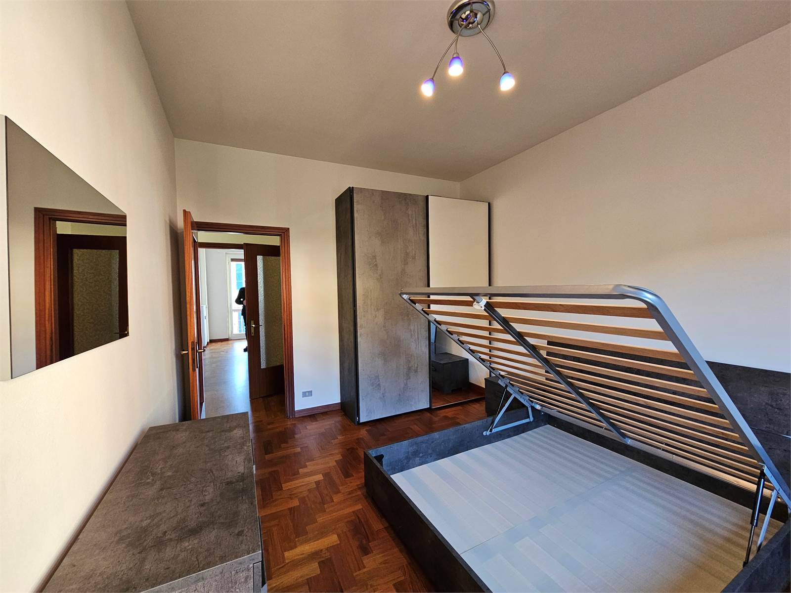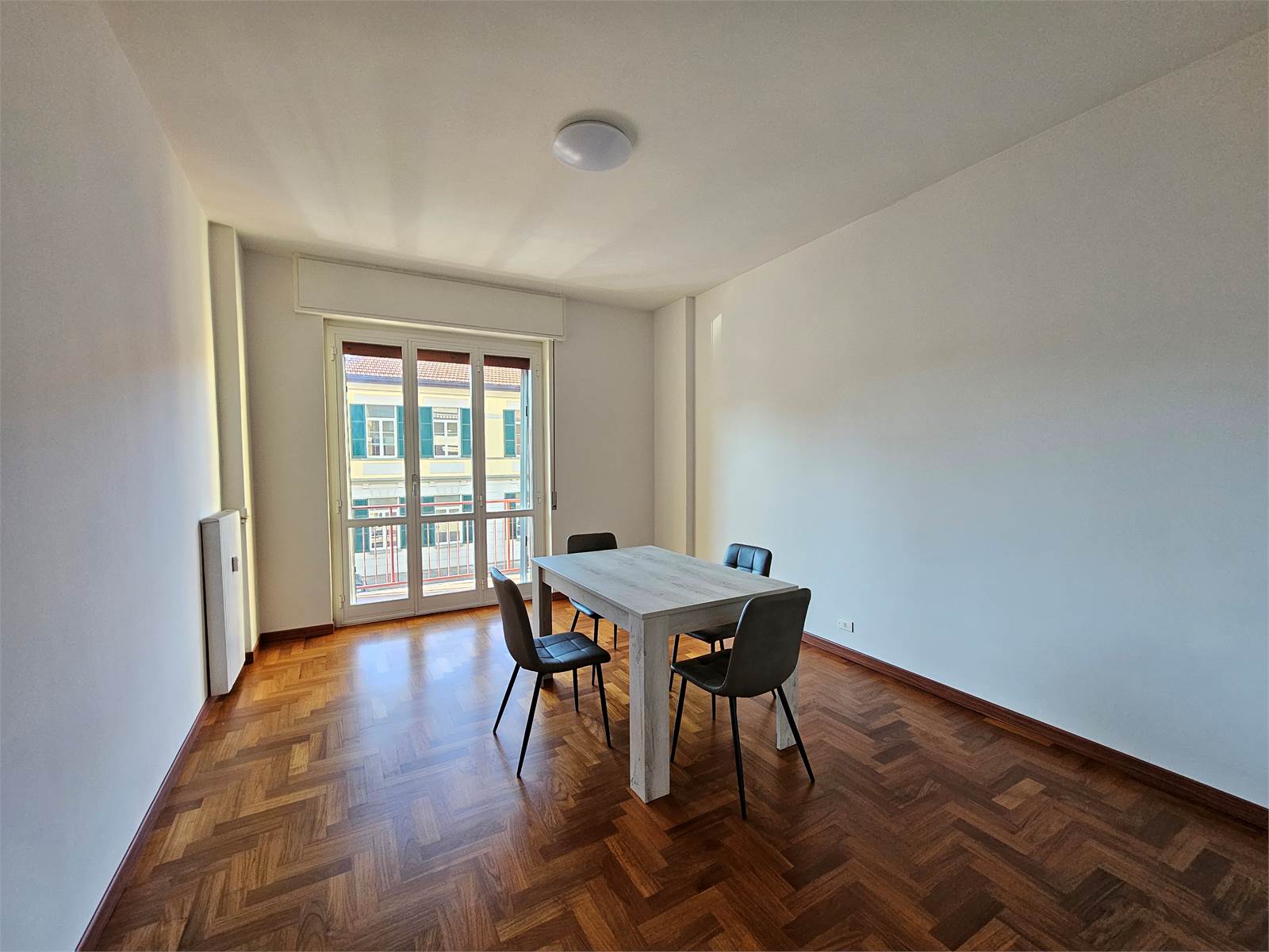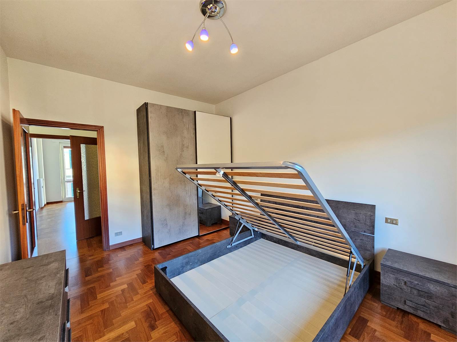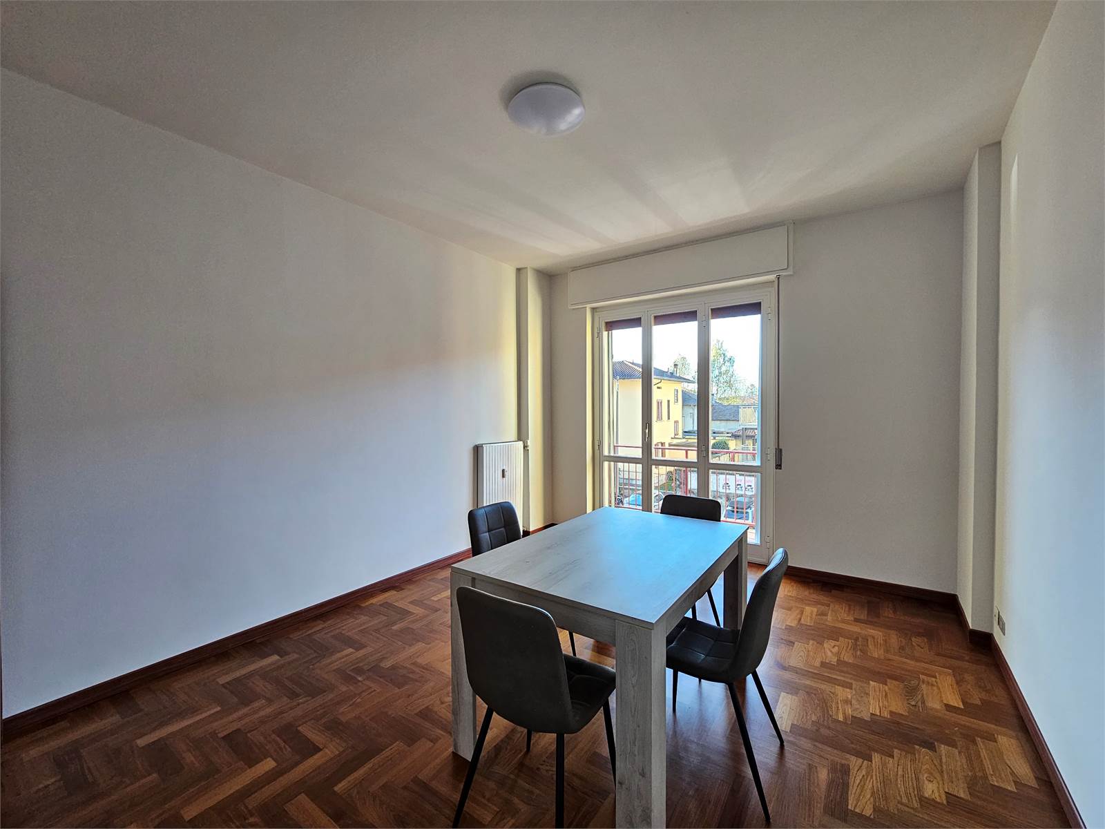 L'appartamento è composto da: ingresso con porta blindata, soggiorno con balcone, cucinotto con balcone, camera da letto matrimoniale, bagno con vasca, ripostiglio oltre a box e cantina al piano terreno.