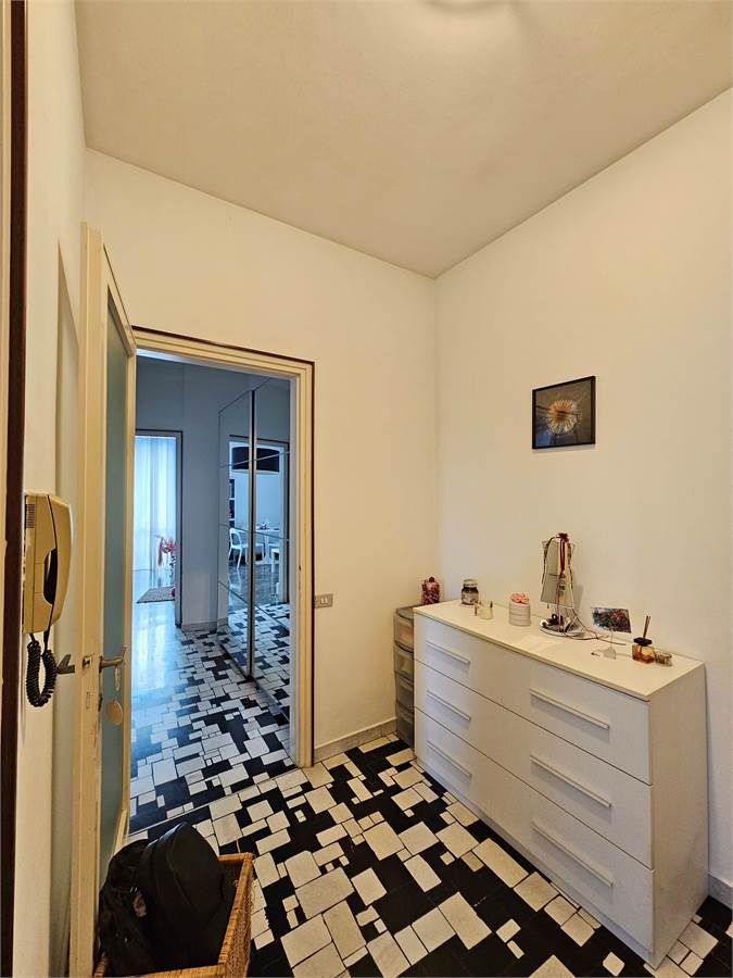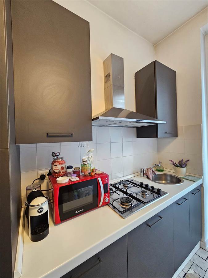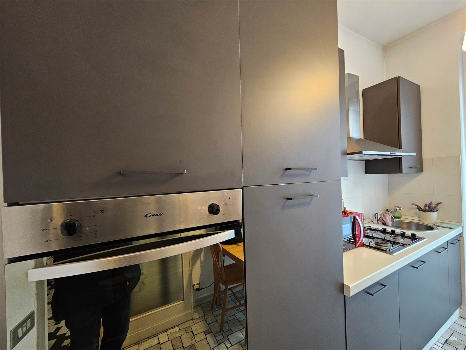 L’ingresso si apre su un luminoso soggiorno con balconcino, dal quale si gode una vista incantevole sul lago e su Brunate, un dettaglio raro per immobili di questa categoria. La cucina è separata, moderna e appena arredata, ideale per chi desidera uno spazio funzionale e ben organizzato.