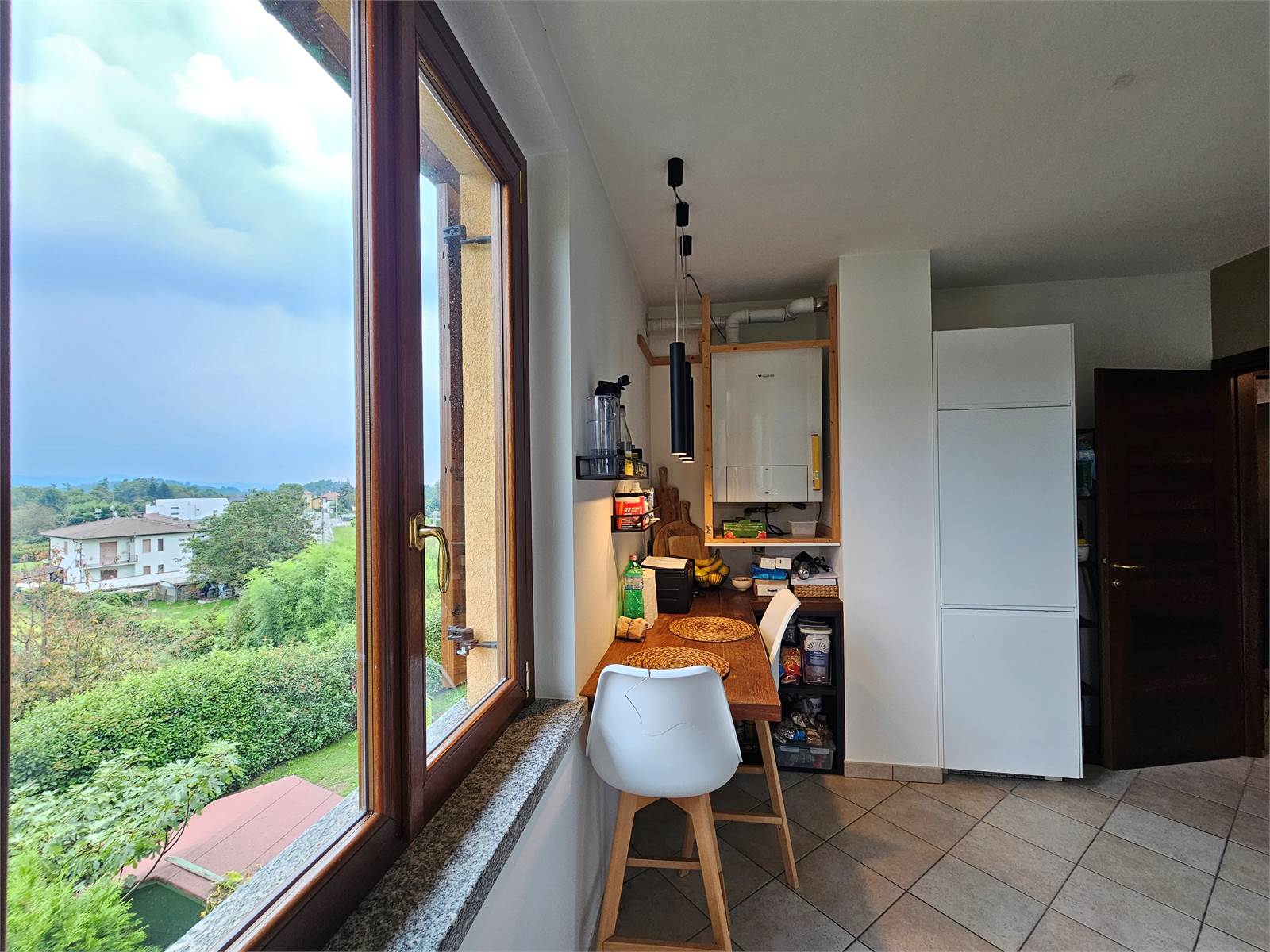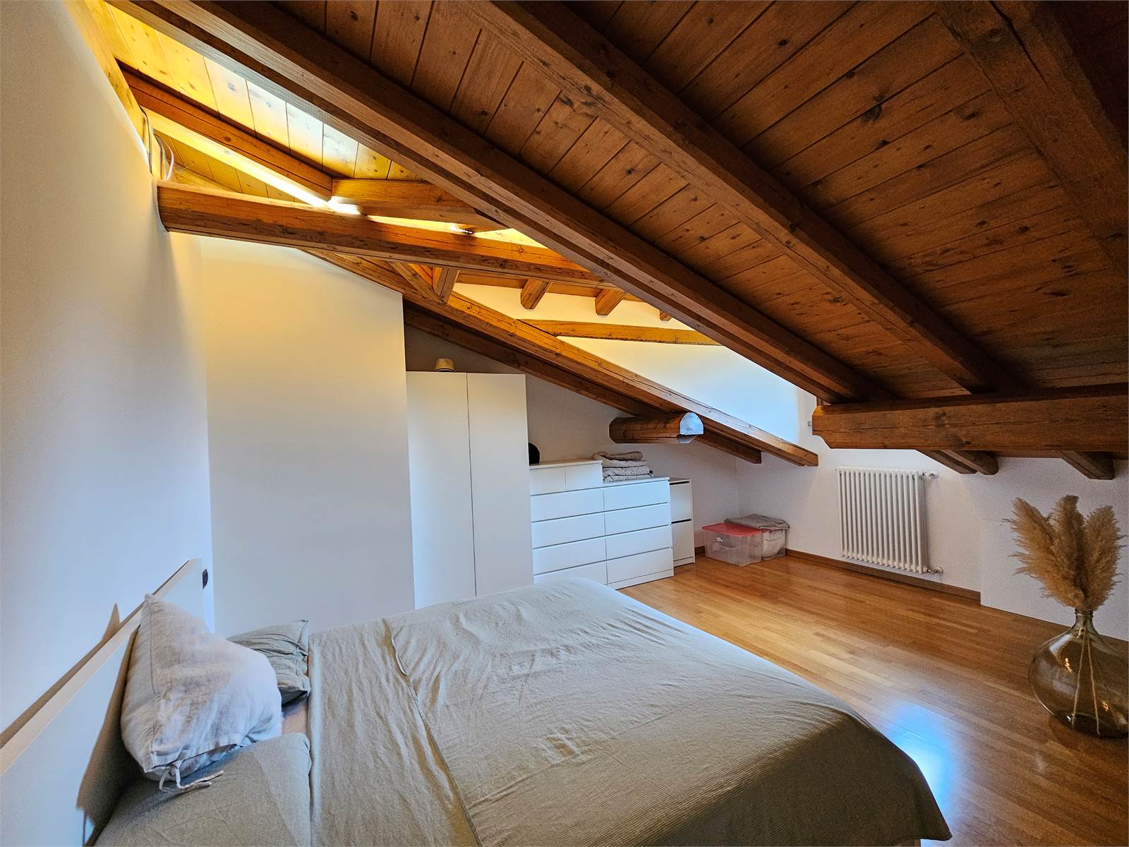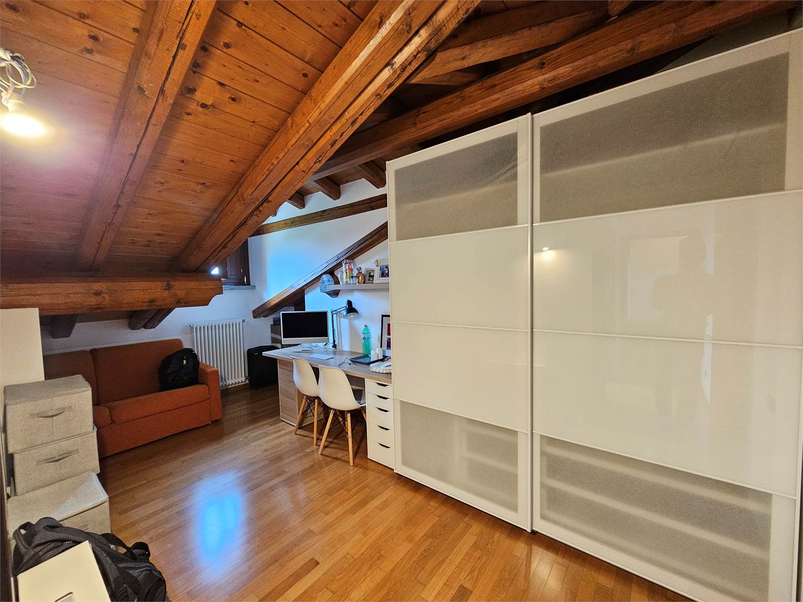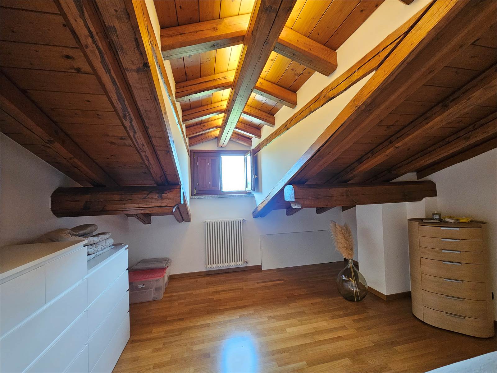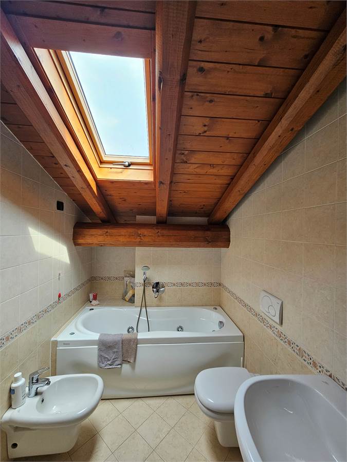 L’abitazione si sviluppa su due livelli. Al secondo piano si trovano l’ingresso con porta blindata, un luminoso salone con terrazzino, una cucina abitabile anch’essa dotata di terrazzino, un disimpegno e un bagno. Il piano mansardato, caratterizzato da affascinanti travi a vista, ospita due camere da letto e un secondo bagno, creando un ambiente caldo e accogliente.